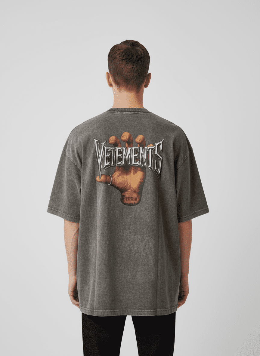 “The WildLoom Acid washed grey premium oversized “VETEMENTS”  t-shirt stands out with its acid-washed texture and street-ready personality. Crafted from heavyweight cotton, it offers a cool, vintage look while maintaining unmatched comfort and a loose fit. This Wild Loom tee is designed for those who love edgy urban fashion and want a versatile piece for nights out, casual get-togethers, or creative environments. The distinctive washed grey finish adds a bold statement to your collection, supporting any mix of jeans, cargos, or joggers.”